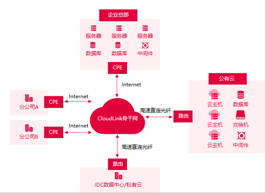 ·基于SD-WAN技木,企业通过Internet可快速连接从企止上公有云、数据中心上云、以及总部-分支机构等各种连接协议,突现简单.易用.高效、零成本的解决方案。 ·利用Cloudlink广泛覆盖的连接网絡,帮助企业用户一键叔春接入CloudlinikSDN骨干网.网内虚拟专线互联能够大幅提升整体組网质量.